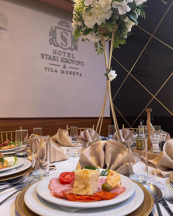 Restoran hotela “Stari krovovi“ čuven je po ljubaznom osoblju, dobroj usluzi i raznovrsnim jelima o kojima se priča nadaleko. Sala restorana je kapaciteta 220 gostiju. Prilagodljivija je za sve vrste svečanosti.